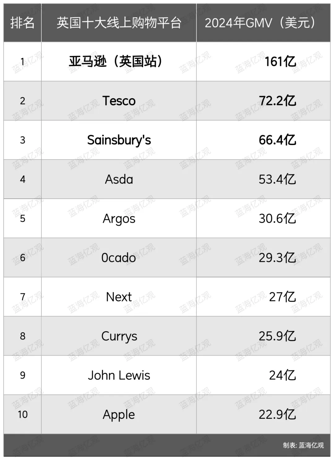 截至 2024 年,英国 GMV 排名前十的线上购物平台中,亚马逊以 161 亿美元的 GMV 位居榜首,而 Argos 仅排名第五。
