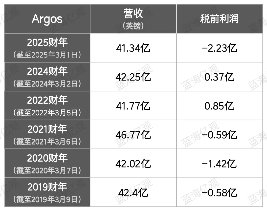 从 2019 至 2025 财年,Argos 的营收基本维持在 41 亿英镑-46 亿英镑之间,但整体上几乎不赚钱。其税前净利润曾连续亏损三个财年,尤其在 2025 财年,其税前利润亏损达 2.23 亿英镑。