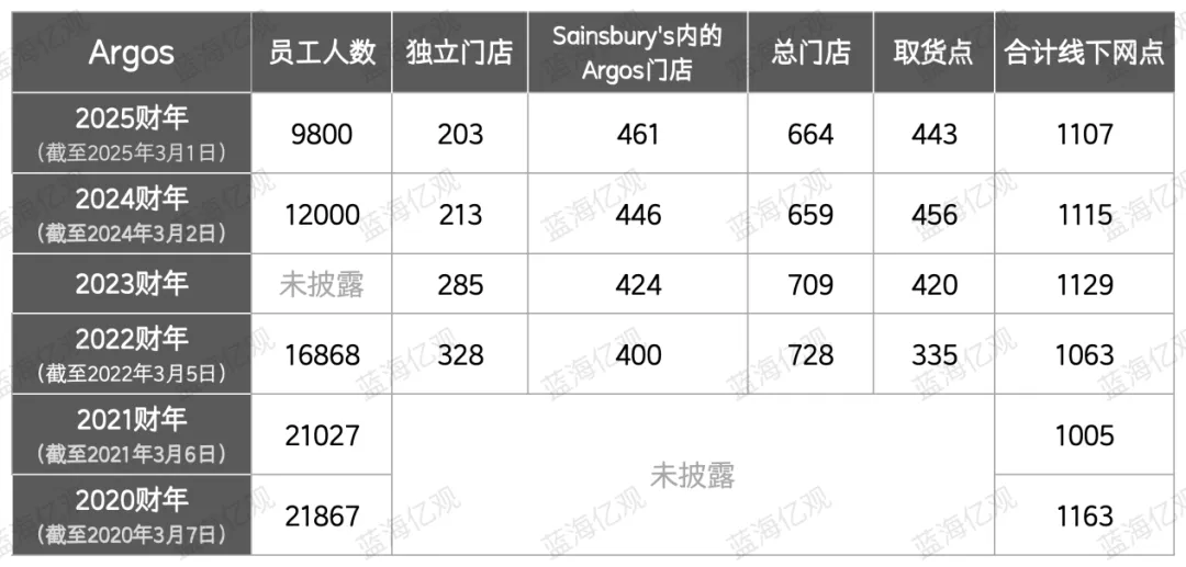 从 2019 财年至 2025 财年,Argos 的员工数量从约 2.2 万,下降至 0.98 万,减少过半,虽然其整体的线下网点数量变化不大,但独立门店数量减少了 100 多家。