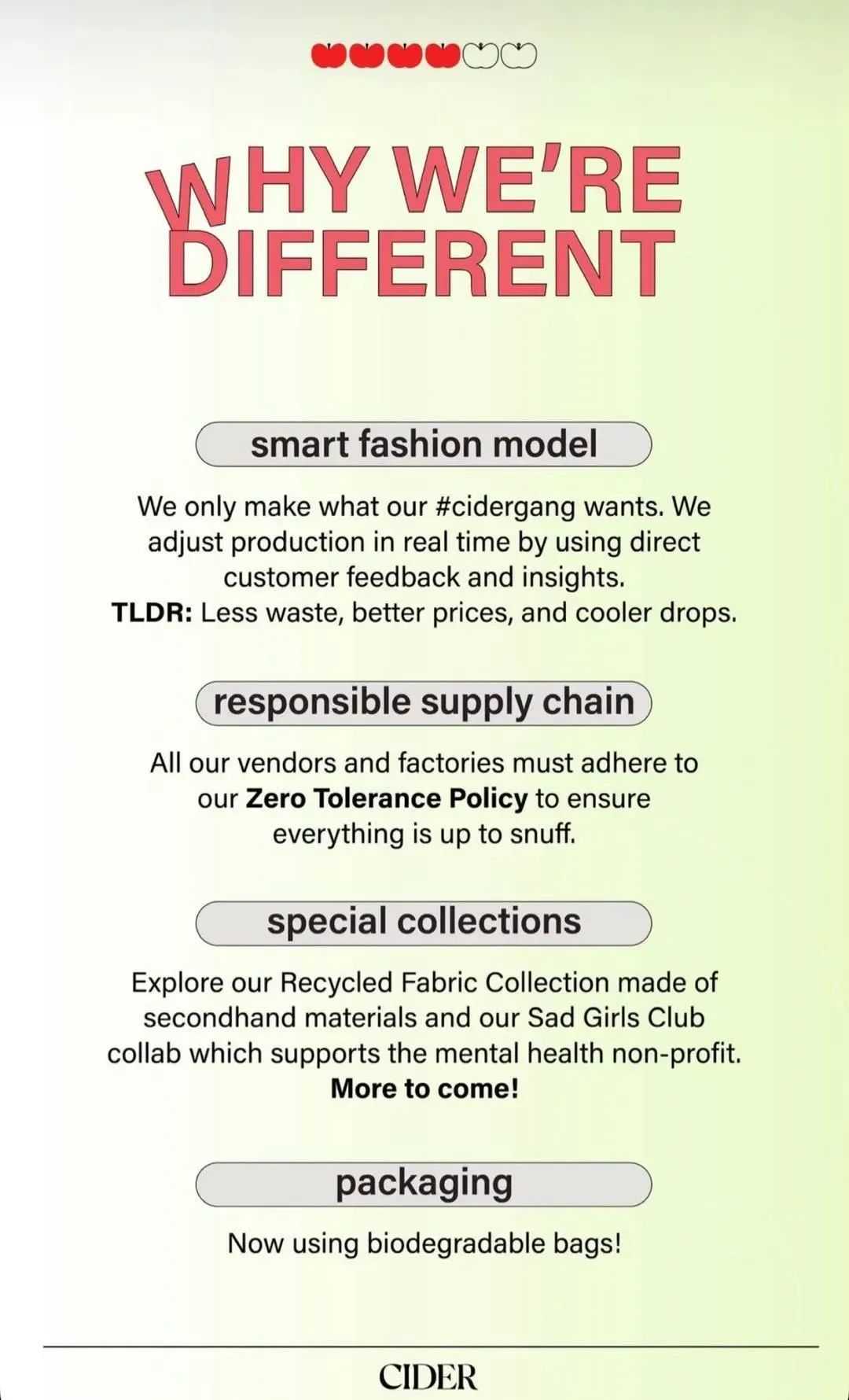 Cider以“用户需求优先、可持续创新、全场景包容”为内核,通过技术化尺码解决方案、数据驱动供应链及透明化责任体系,打破快时尚行业的传统壁垒,构建了“实用价值+情感共鸣”的新一代品牌范式。