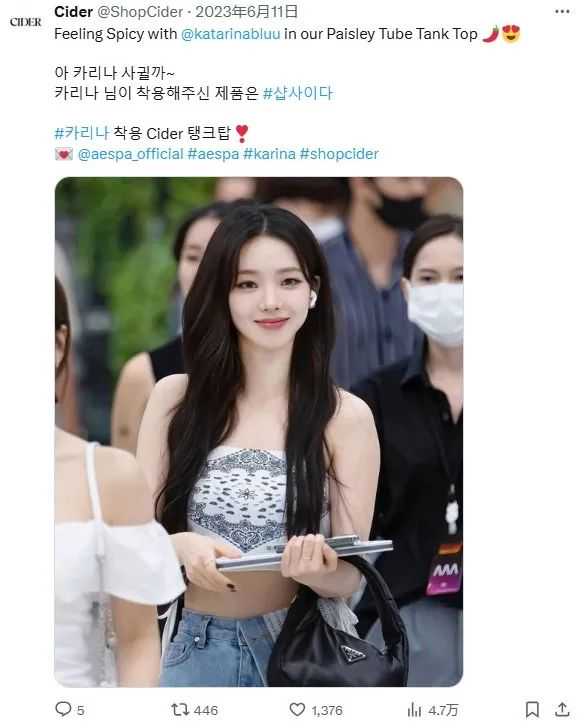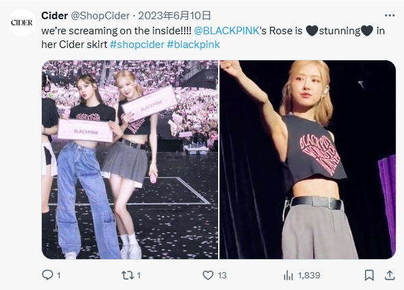 在社交媒体上,Cider 凭借独特的时尚设计,吸引众多流量明星自发分享穿搭。韩国女团 BLACKPINK 成员金珍妮、朴彩英多次在 Instagram 发布身着 Cider 单品的私服照,无论是甜辣风短上衣还是个性牛仔套装,都展现出品牌的潮流感;aespa 成员柳智敏也在 Instagram 分享日常穿搭,身着 Cider 的造型迅速引发粉丝热议。这些明星的分享让 Cider 迅速占领各大社交平台热门话题,相关穿搭动态持续刷屏,成功掀起一波又一波的时尚讨论热潮,极大提升了品牌在全球年轻群体中的知名度与影响力。