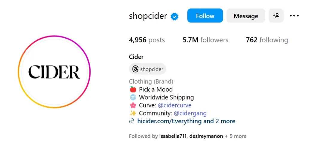 @shopcider:面向全球Z世代女性,从创立初期锁定Pinterest式美学风格,发布场景化服装展示视频,涵盖多元时尚元素,契合Z世代追求潮流、个性的审美需求,吸引大量时尚敏感、乐于在社媒获取与分享时尚资讯的年轻女性关注。