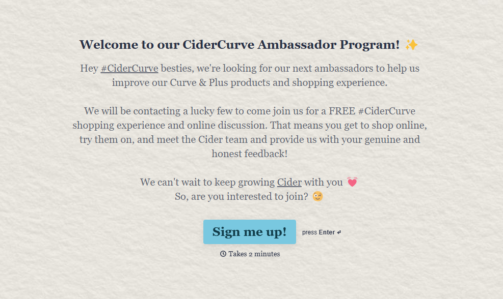 CiderCurve大使计划:在Instagram等平台发起,招募用户参与优化Curve系列和大码产品及购物体验。幸运用户可享受免费购物、参与线上讨论会,向Cider团队提供真实反馈。这一活动既增强用户对品牌的参与感,又帮助品牌深入了解用户需求,优化产品与服务。