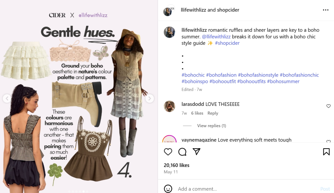 例如,Cider携手ins 穿搭博主@llifewithlizz,精心打造系列穿搭海报,将品牌丰富单品巧妙组合成微成套穿搭。从浪漫蕾丝风勾勒优雅气质,到复古田园风传递文艺情怀,再到自然风彰显随性洒脱,多元风格诠释时尚的无限可能,为消费者提供兼具创意与实用性的穿搭灵感。
