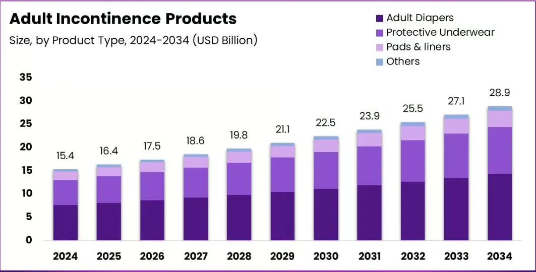 数据显示,全球成人失禁产品市场规模预计在 2034 年达到 289 亿美元,预测期(2025-2034 年)内复合年增长率达到 6.5% 。