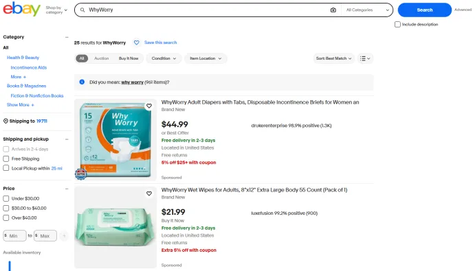 通过公开平台的检索,我们只在 eBay 上发现第三方卖家的零星销售记录,除亚马逊外,并没有看到 WhyWorry 的官方店铺或其他稳定销售渠道。