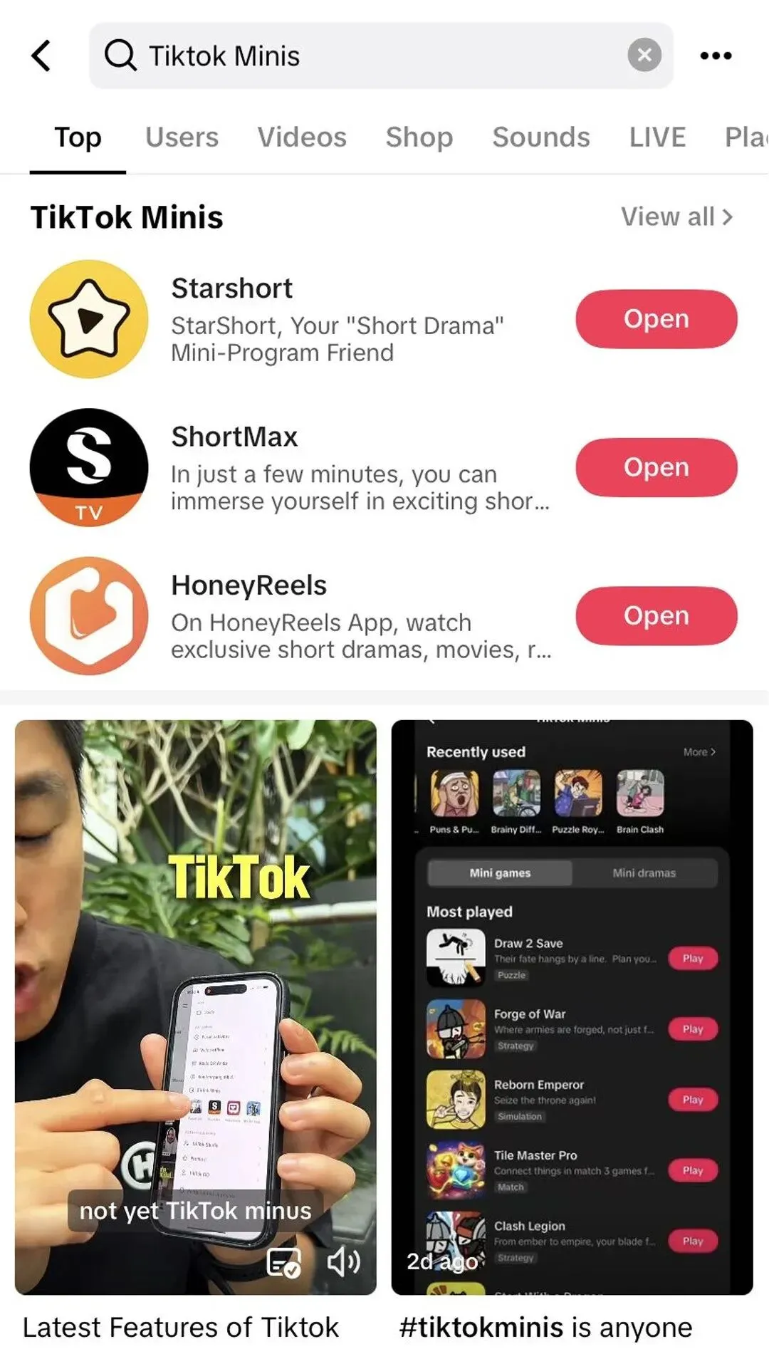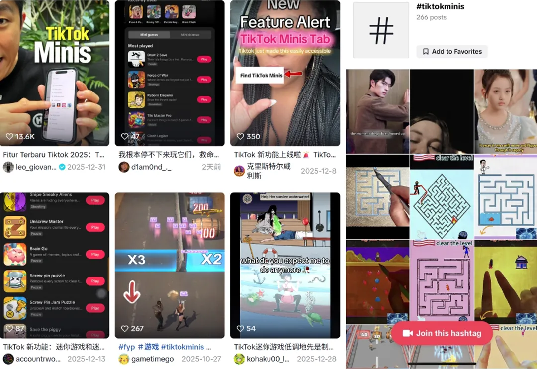 不过,据第三方数据显示,12月30日-1月5日期间,TikTok Minis相关搜索请求环比12月中旬增长超300%,尚未进入平台搜索热榜前100名,其衍生词条如#TikTokMinis、#MinisGames、#MinisShorts等,单条热门内容播放量可达数十万,但整体累计播放量仍处于千万级水平,远低于Reelshort等头部短剧标签数据。