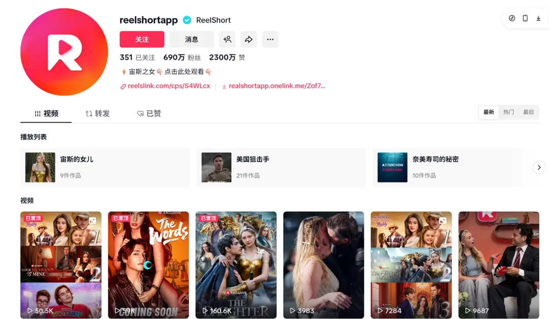 而更棘手的是,现在入驻Minis板块的短剧应用更多是海外短剧赛道的中小玩家,如ReelShort、DramaBox这类的头部玩家并未入驻其中。且对于这些已经有一定规模的付费用户基数和成熟的付费体系的玩家来说,TikTok流量增量还不足以让他们放弃对定价权、收益分配等利益相关的核心控制权。因此,这类玩家更倾向于通过TikTok平台内官方账号发布短剧内容引导用户下载或转移其APP端完成转化,或者借助TikTok的Series功能发布付费视频,而非直接入驻Minis受平台规则限制。