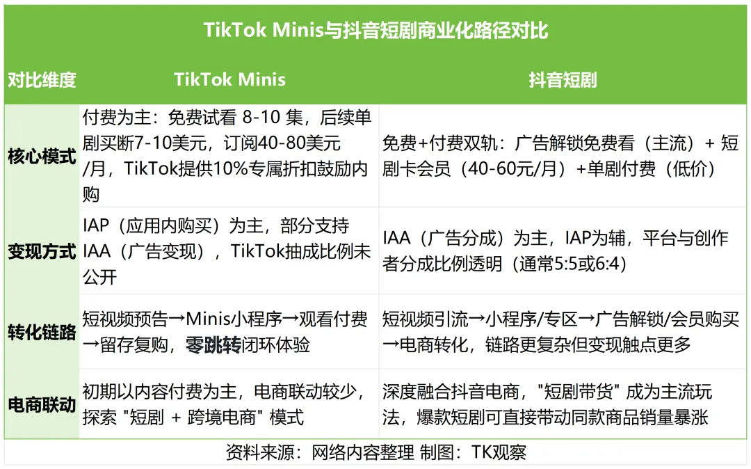 且同样属于“短平快”领域的新兴势力,TikTok与短剧也存在共性。在内容形态层面,短剧节奏精炼、强情绪化驱动、高互动性的特质与TikTok自身内容生态调性以及用户偏好存在高度同频,这种同频更便于平台以更低的成本投入将庞大的短视频用户引入短剧内容消费场景。而在商业化版图中,短剧所代表的内容付费模式,也可以作为对现有的电商板块与广告投入板块的重要补充与完善。再者有抖音短剧商业化体系的成功案例在前,TikTok推出Minis板块也在情理之中。