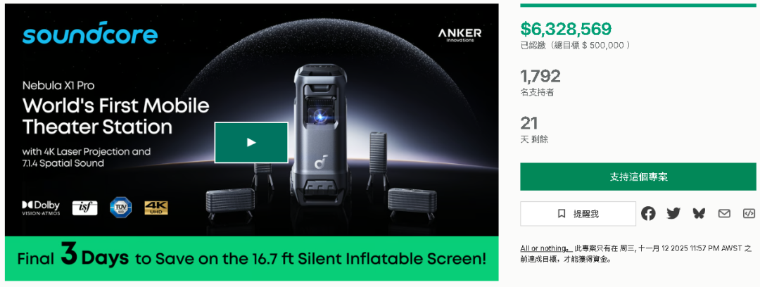 2025 年 9 月底,Nebula X1 Pro 高端移动影院投影仪正式登陆 Kickstarter,一经上线便引发强烈反响,仅用 10 天时间,项目就斩获近 500 万美元的众筹金额,截至目前,该产品的销售额已经达到 632.8 万美元,吸引了 1792 位支持者,预计将于今年 12 月交付。当前距离众筹结束还有 22 天,接下来销售额还将继续攀升。