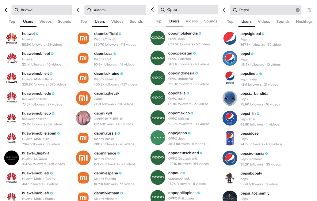 Huawei、OPPO、Xiaomi、Pepsi等知名品牌均在TikTok上矩阵布号(一般一个国家对应一个账号)。由此可见,TikTok已成为了众品牌的新品宣发、品牌营销推广的主阵地。