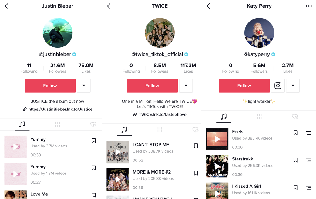 巨大的量级也让TikTok成为了大牌明星的必争之地。JustinBieber、Katy Perry、TWICE、Rihanna等,TikTok作为一个音乐宣传的最佳之处,用户量大、门槛低、新颖的方式让越来越多的歌曲选择在TikTok上进行宣发。