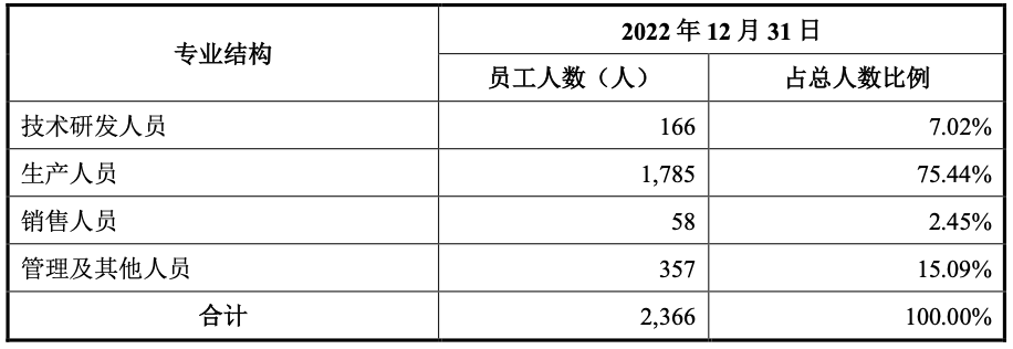 截至 2022 年年底,公司人数为 2366 人,其中生产和研发占比超过 80%。