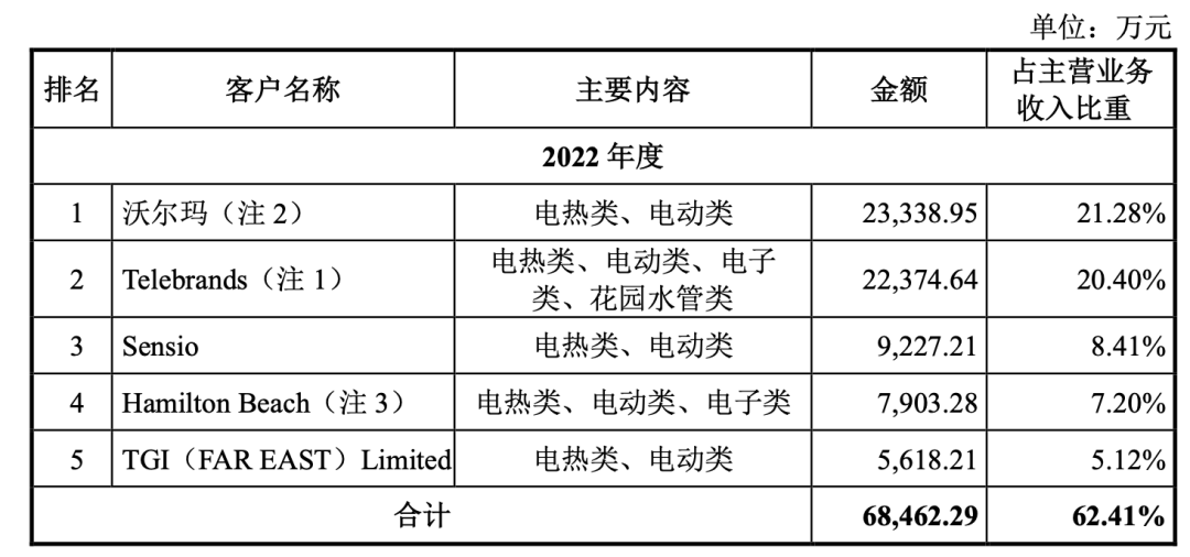 其中,沃尔玛是公司多年以来排名前三的客户。2022 年,沃尔玛累计销售达到 2.33 亿元,占主营业务收入比重 21.28%。而在 2023 年上半年,Telebrands 则跃升成为公司第一大客户。