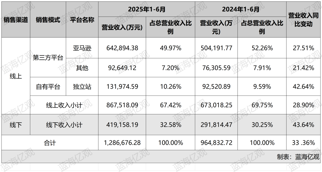 安克的最大块收入,依然来自亚马逊。近年来,安克一直努力摆脱“亚马逊依赖症”,持续发力线下多渠道,奋力淡化其“电商品牌”乃至“亚马逊品牌”的标签,今年上半年将其在亚马逊的营收占比,下降到了一半以下(49.97%,约 64.28 亿元),而其线下渠道的营收占比,提升到 32.58%(约 41.91 亿)。