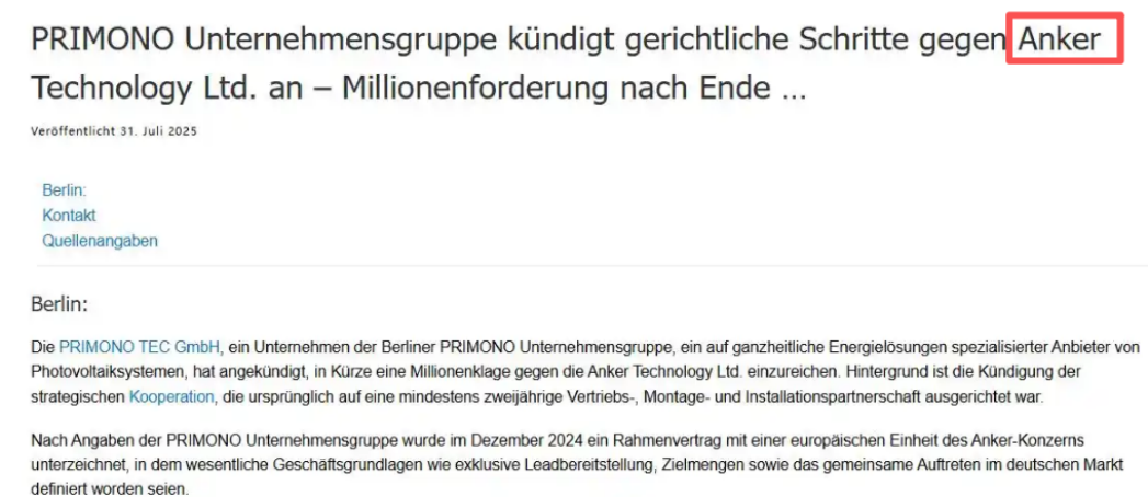 2025 年 7 月,多次协商无果后,PRIMONO 集团正式宣告终止与安克的合作,并将其告上了法庭。