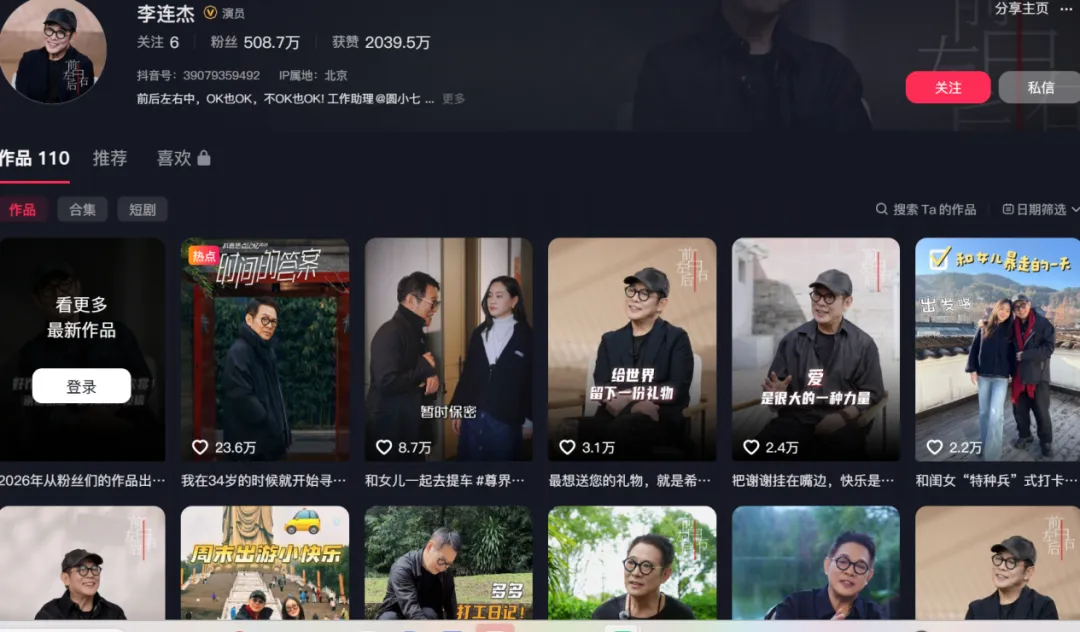 相比之下,李连杰在 TikTok 上是打算持续输出与功夫相关的内容,反复解释动作、理念和文化背景,试图建立一个以“功夫”为中心的社区。在这一阶段,其商业化并未被放在“桌面”上,甚至仍处于模糊状态。