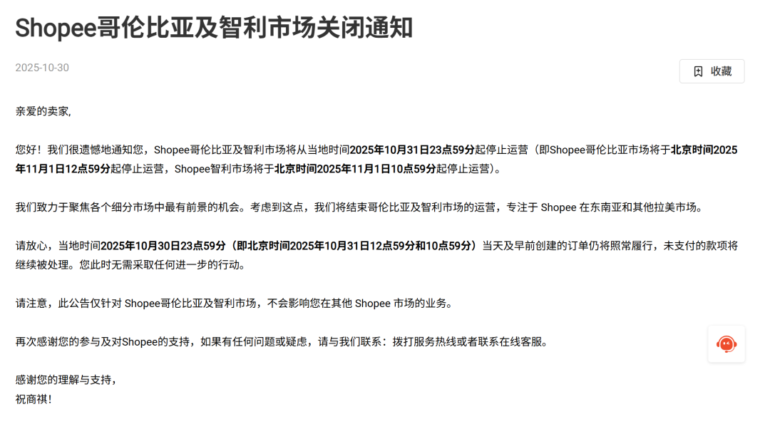 10 月 30 日晚些时候,Shopee 突然发布通知将关闭哥伦比亚和智利市场。