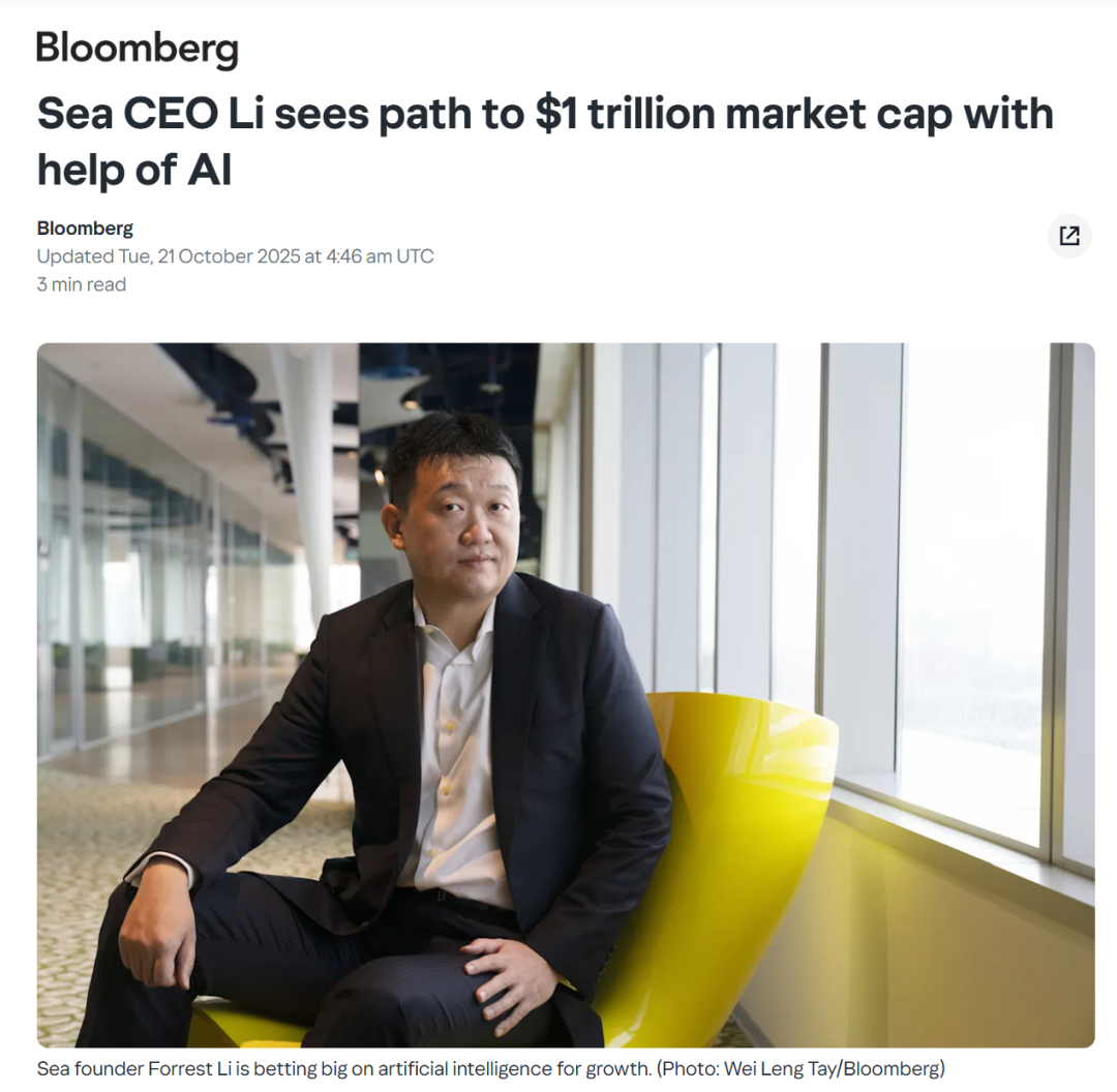 Sea CEO Forrest Li 认为,人工智能将助力公司实现万亿美元市值,图源:彭博社