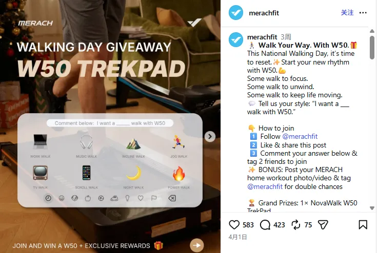 同时,MERACH 在社媒平台常态化发起 UGC 激励活动,比如节日限定的健身打卡挑战、居家健身日常等,以品牌爆款产品作为奖励,引导用户发布带品牌标签的训练视频、使用体验。这类活动不仅用极低的成本激活了海量原生内容,更沉淀了大量真实的居家使用场景,形成了 “达人种草 - 用户跟风 - 口碑扩散” 的良性循环。