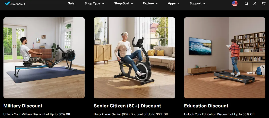 3.独立站端,MERACH 为军人、60 岁以上老人、学生群体推出最高 30% 的专属福利,兼顾转化提升与品牌温度;