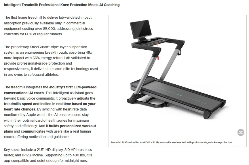 2026 年 CES 发布搭载大模型 AI 教练的高端智能跑步机,正式入局高端智能健身赛道,完成从 “家用器械厂商” 到 “AI 智能健身科技公司” 的品牌换脑。