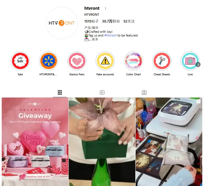 在 Instagram 这类视觉导向平台上,HTVRONT 品牌则聚焦于展示最精美、最富吸引力的成品图片和短教程视频,并在简介中直接放置官网链接,将平台作为品牌美学展示柜和官网的引流跳板。