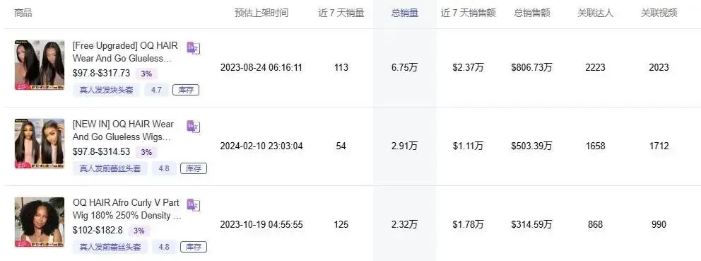假发类产品本就适配 TikTok 短视频生态——短时间内可直观展示佩戴效果,快速传递产品价值。此前 OQ Hair 的无胶头套就靠“3 秒佩戴”短视频爆火,累计销售额突破 5350 万美元。