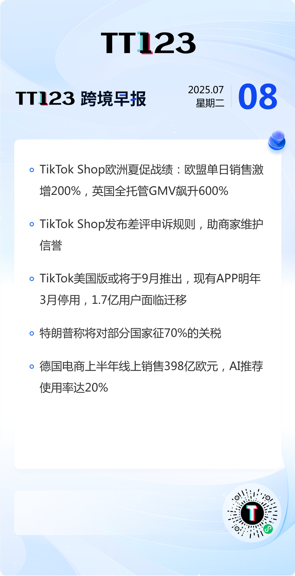查看更多 TikTok Shop欧洲夏促单日爆发超200%/TikTok Shop推出差评申诉规则/TikTok美国版或将于9月推出
