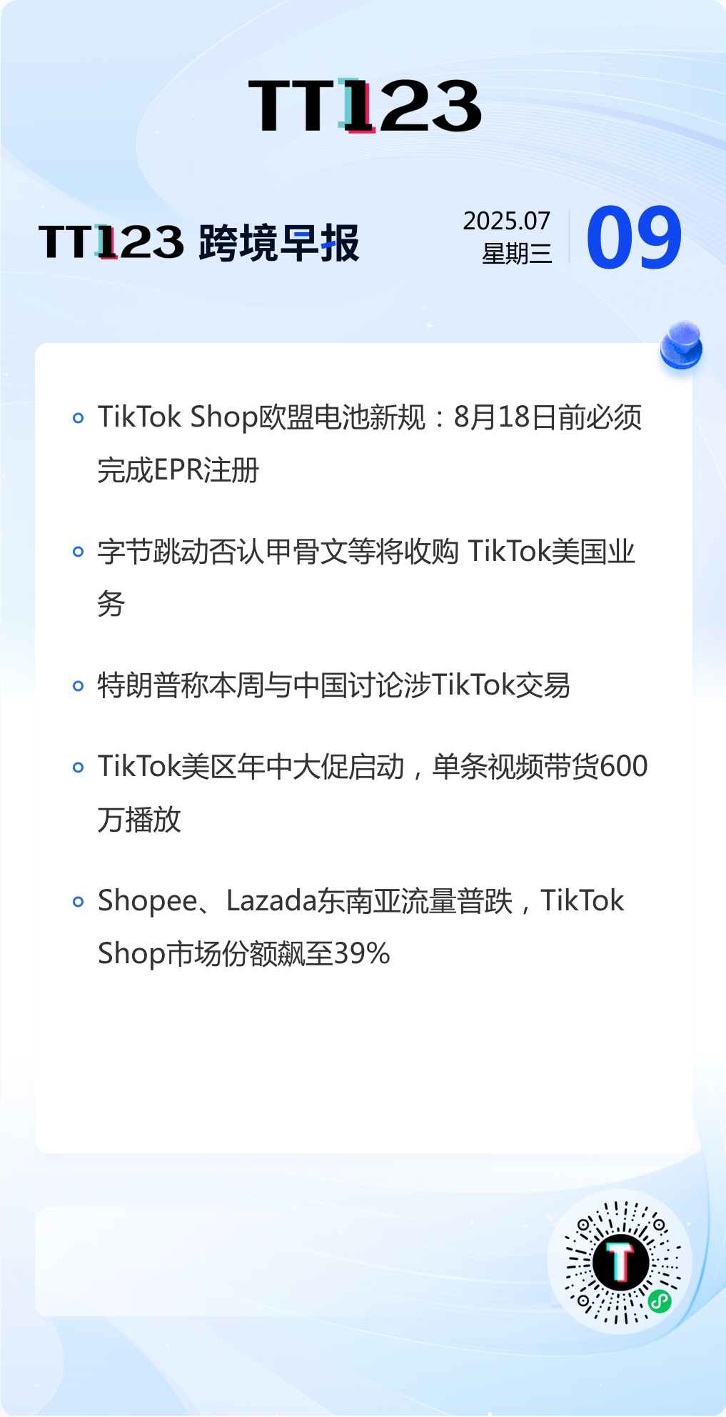 查看更多 TikTok Shop发布欧盟电池新规/字节跳动否认甲骨文等将收购 TikTok美国业务/特朗普称本周与中国讨论涉TikTok交易