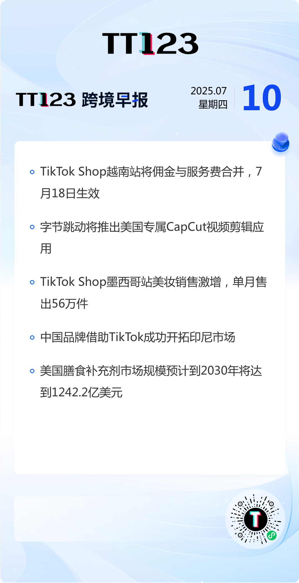 查看更多 TikTok Shop越南站将佣金与服务费合并,7月18日生效/字节跳动将推出美国专属CapCut视频剪辑应用/TikTok Shop墨西哥站美妆销售激增