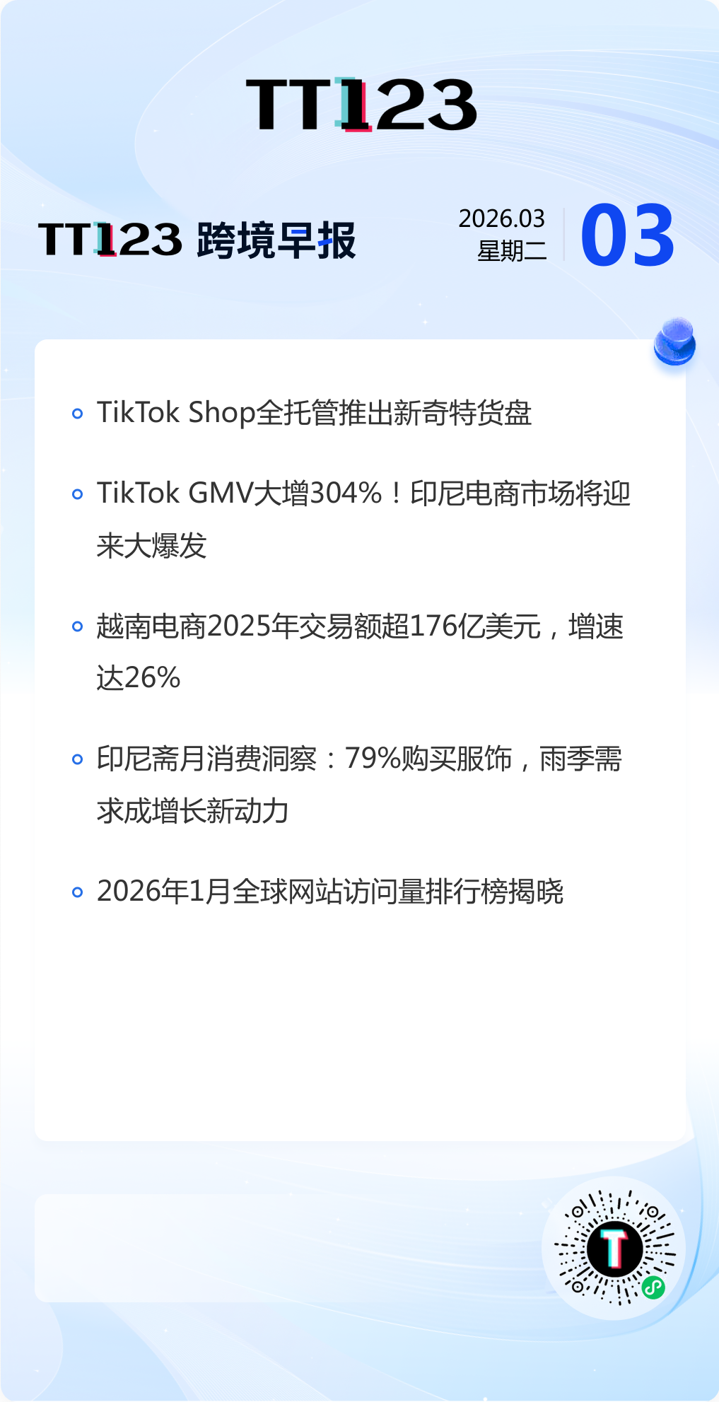 TT123获悉,近日,TikTok Shop全托管模式正式发布“新奇特货盘” ,该货盘聚焦居家日用、美妆个护、宠物用品、数码等多元类目,所有商品均经过海外市场真实消费场景验证,商家无需自行测品即可在平台直接添加同款,实现“一键复制好生意” 。据悉,入围“新奇特货盘”的商品精准踩中海外流行趋势与功能创新需求,具备极高的爆品潜力。为了助力商家抢占开年红利,平台在2026年2月1日至6月30日期间,为相关商家提供 “绿通”严选货盘、多场域营销支持、直降折扣、专属达人合作 以及 Ads Credit激励等多重专属资源扶持。